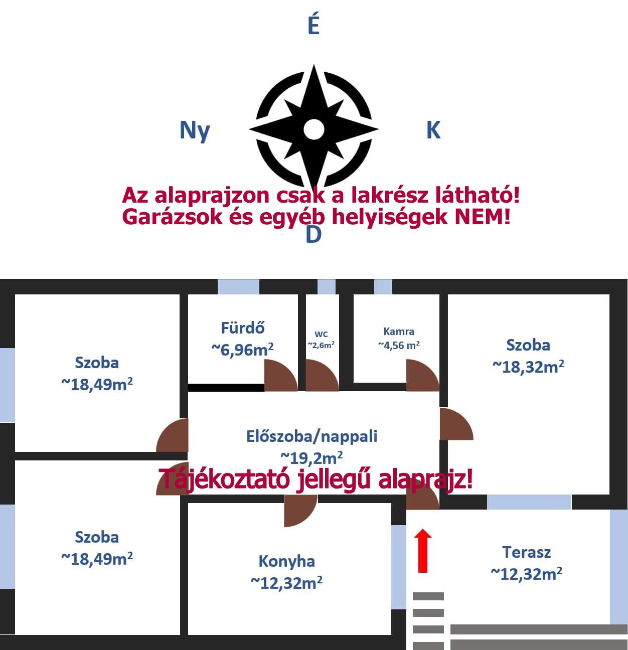 A tágas, kb. 97m2+terasz lakrészben, 3 különálló és külön bejáratú nagy szoba, előszoba, nagy konyha, fürdőszoba, külön WC és kamra padlásfeljáró található.